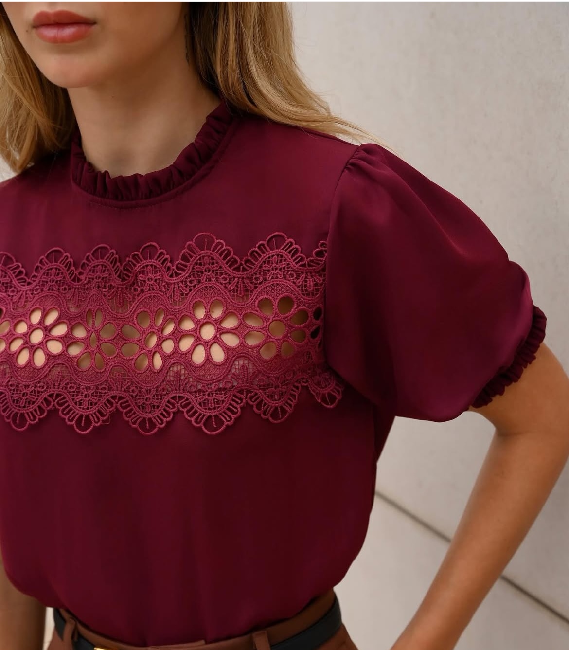 Blusa em crepe, com gola franzida, manga curta e detalhe em guipir no busto.